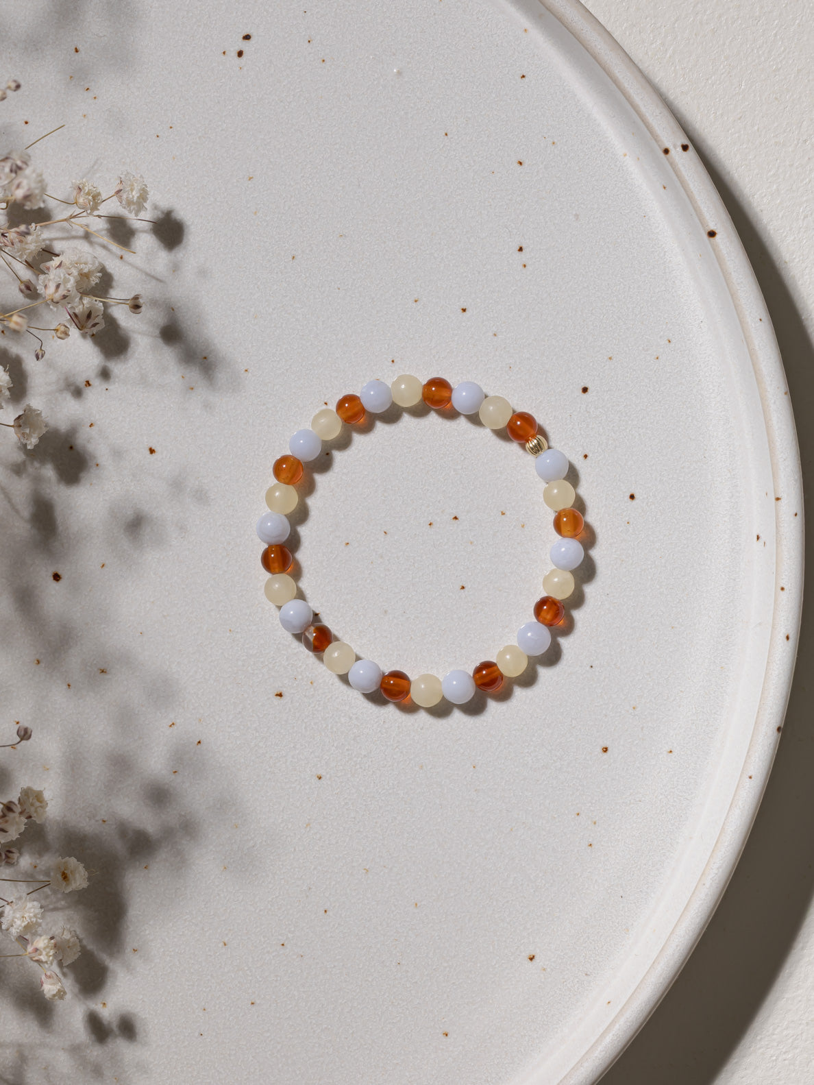 Dieses fröhliche Armband vereint die sonnige Energie des Orangencalcits mit der ruhigen Kraft des Chalcedons und der vitalen Ausstrahlung des Karneols – ein liebevoller Begleiter, der Kinder im Alltag stärken und ermutigen soll.