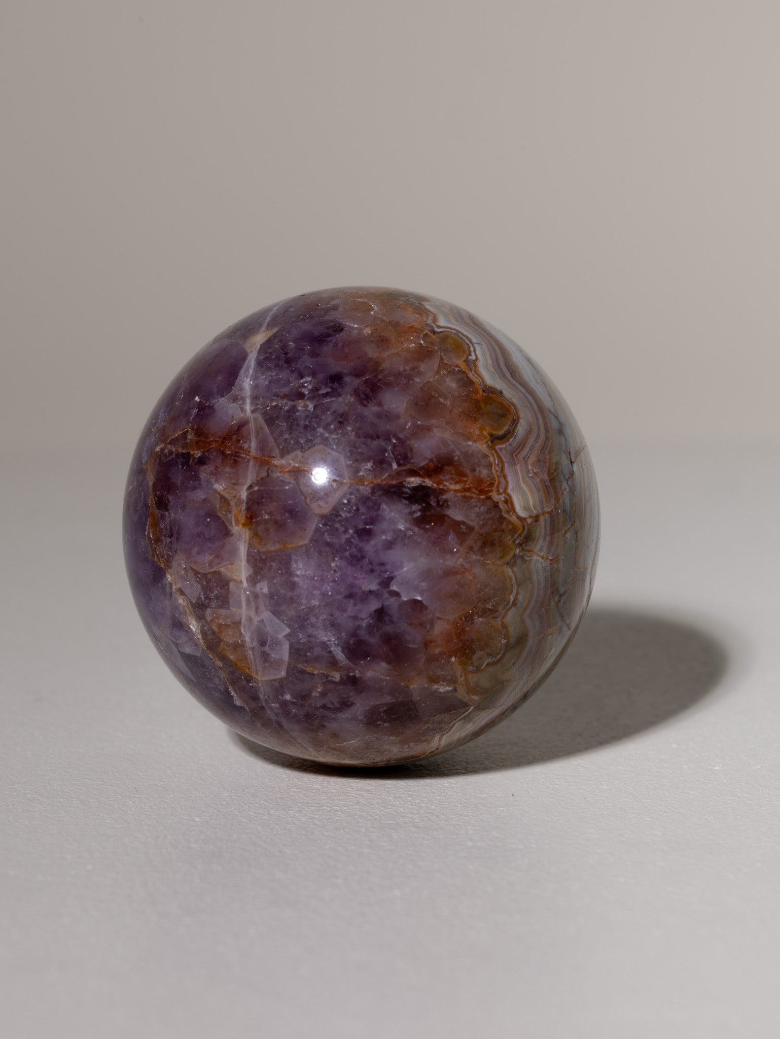 Amethyst-Achat vereint violette Bänder mit Achatstrukturen. Er gilt als Stein der Ruhe, Balance und spirituellen Klarheit.
