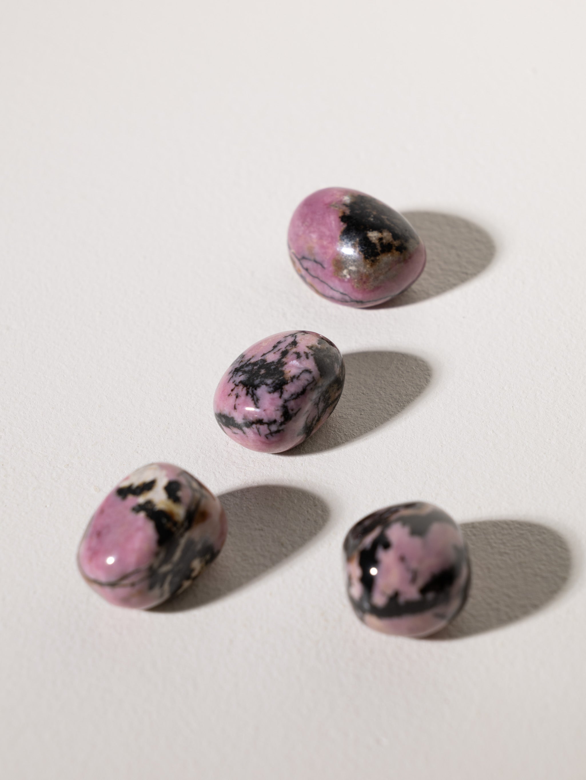 Rhodonit ist rosa bis rot mit schwarzen Adern. Er gilt als Stein der Liebe, des Mitgefühls und der Heilung.