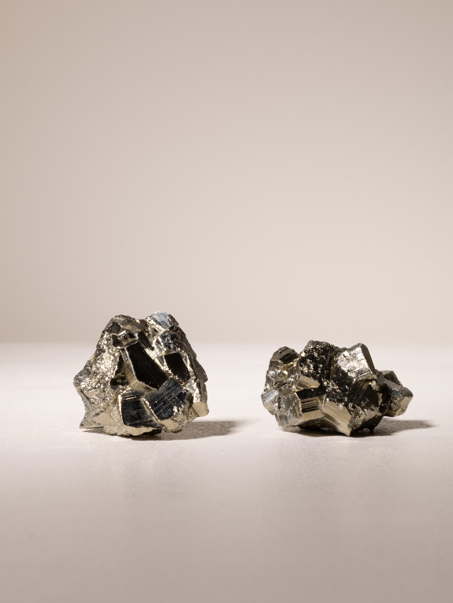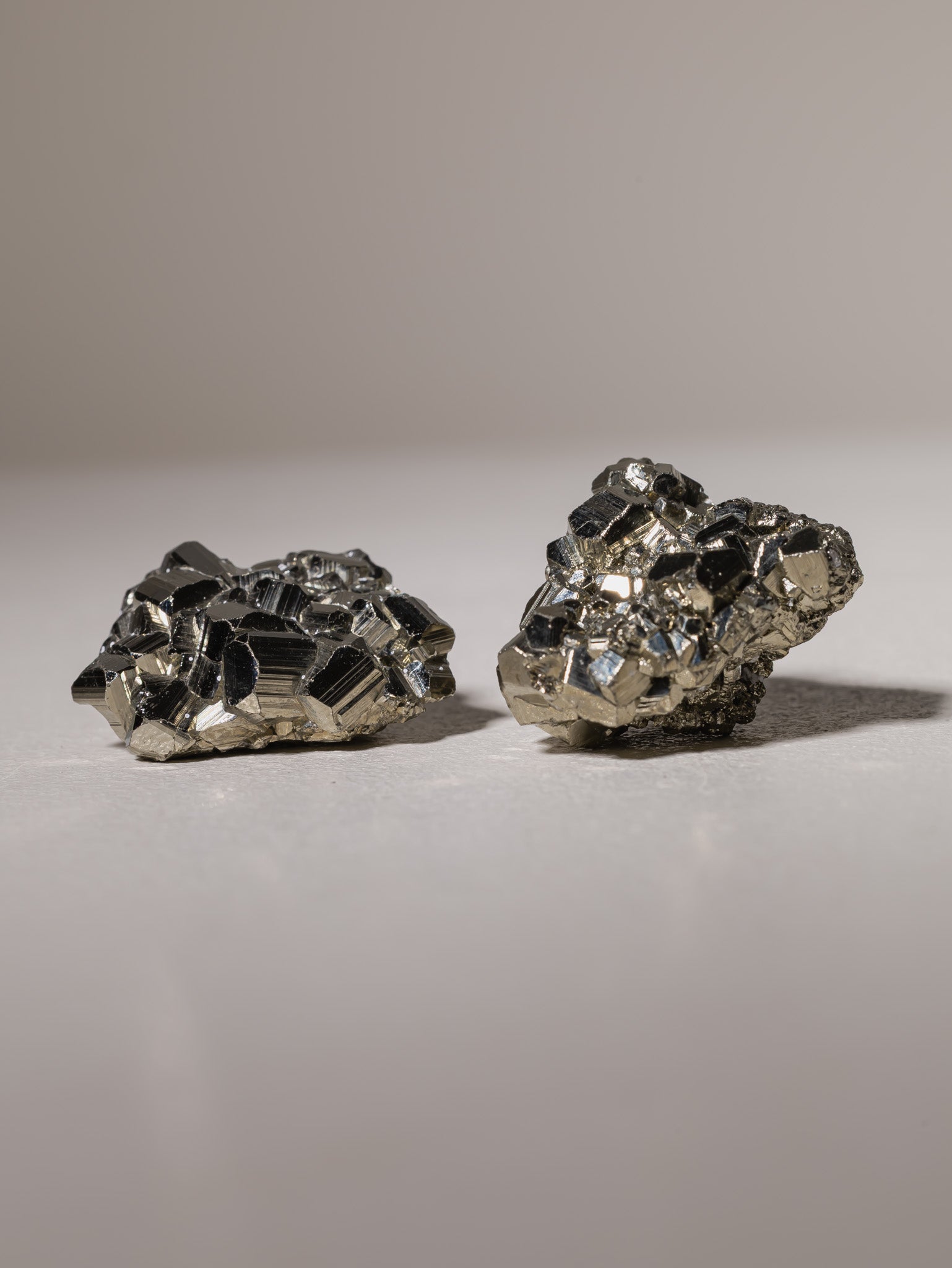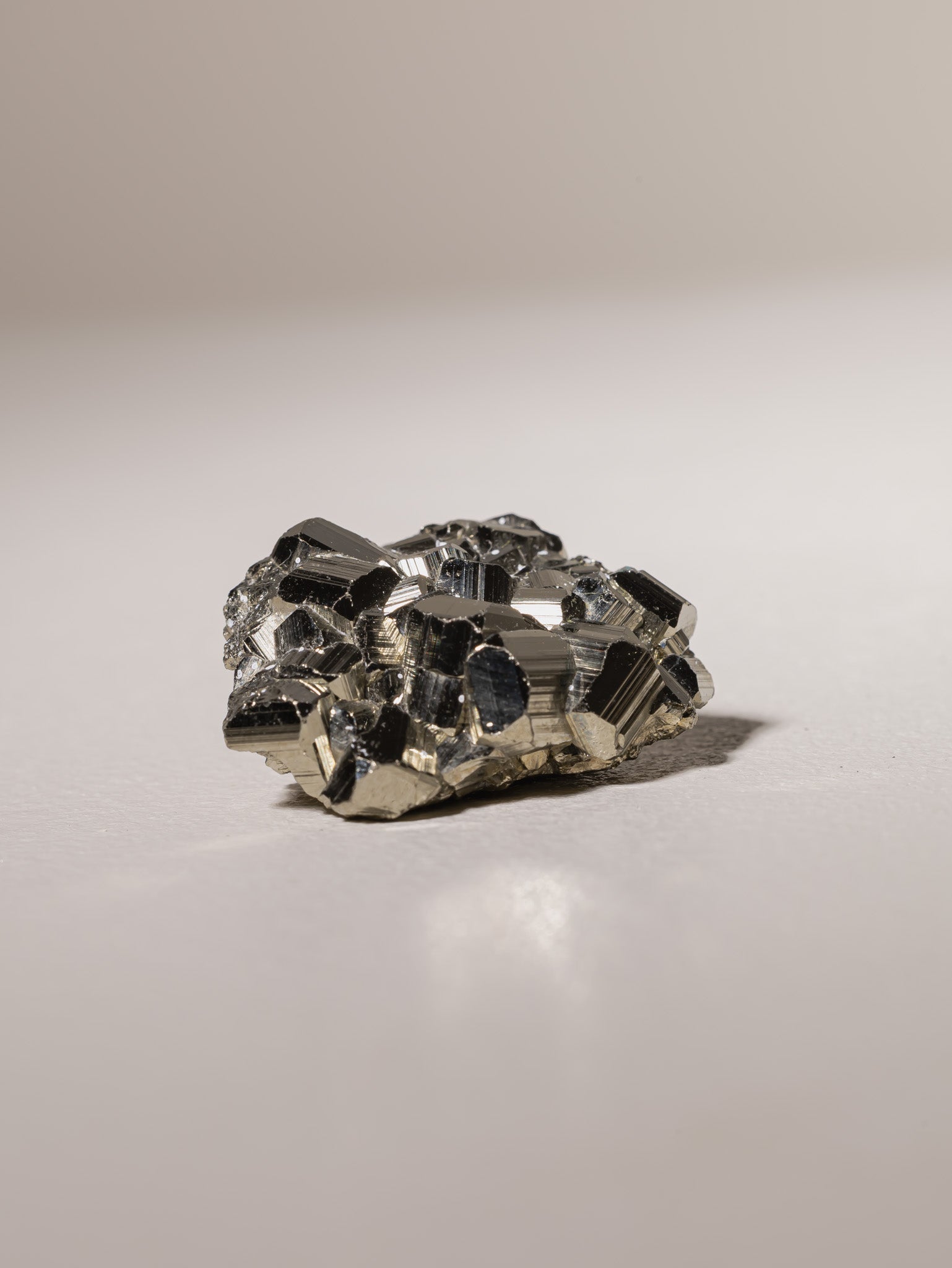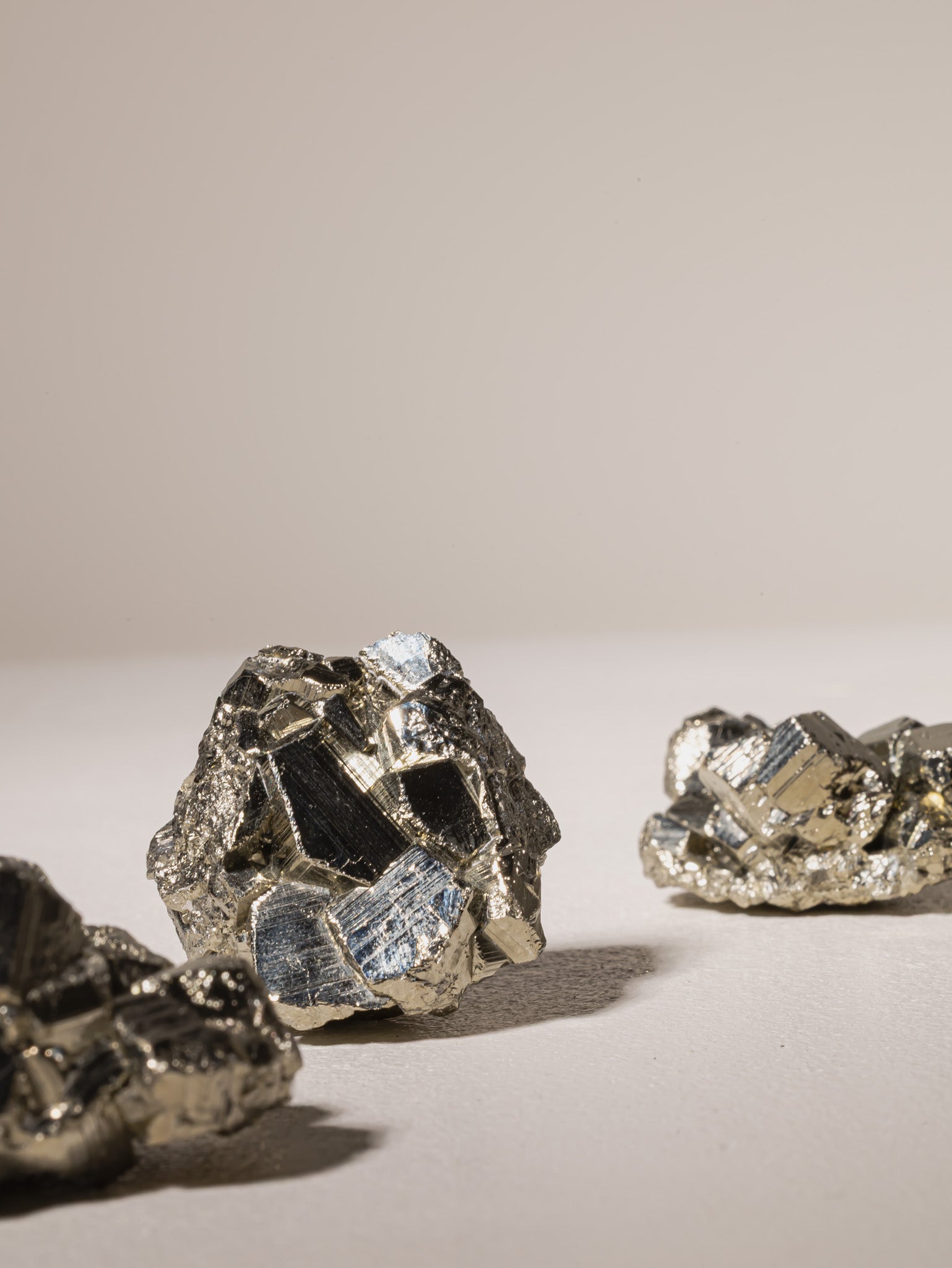 Pyrit glänzt goldmetallisch in Kristallform. Er gilt als Schutzstein und Symbol für Wohlstand und Stärke.