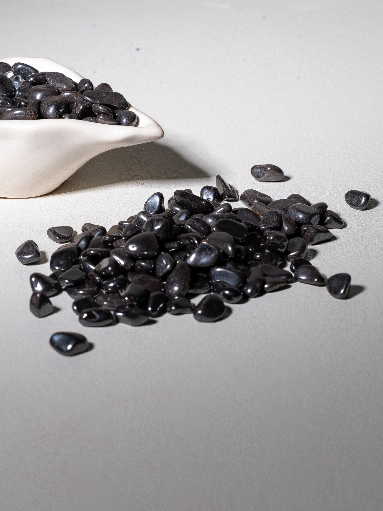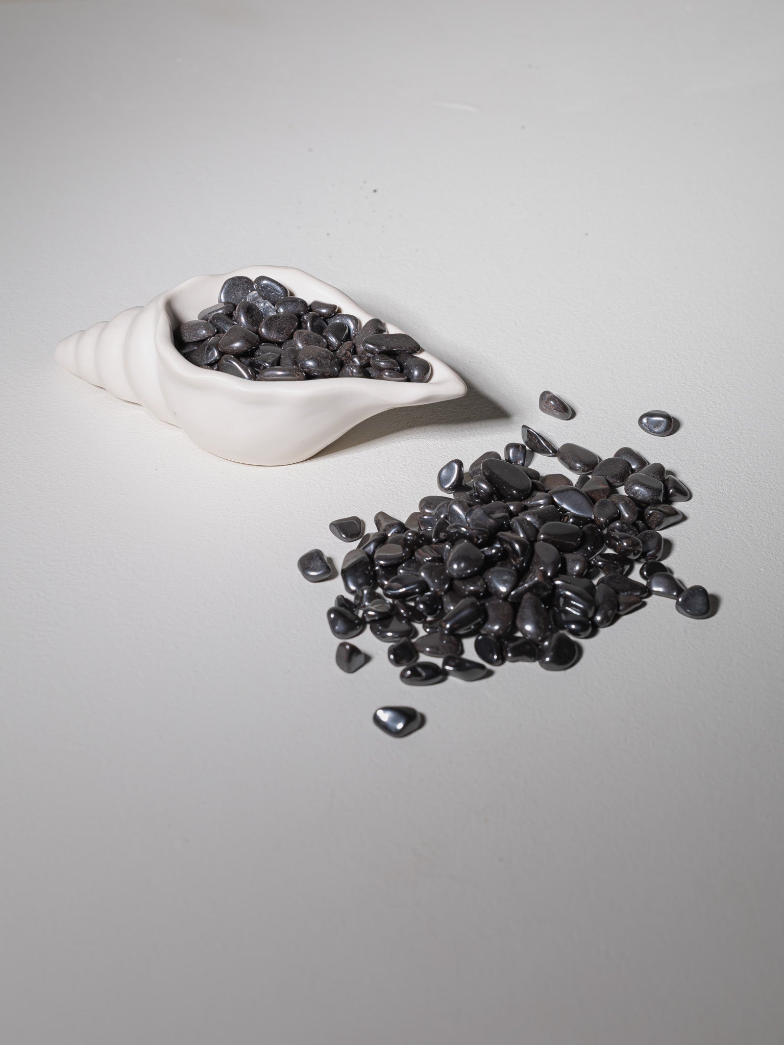 Hämatit ist metallisch glänzend und tiefgrau. Er wirkt erdend, stärkend und gilt als Stein für Stabilität und Durchsetzungskraft.
