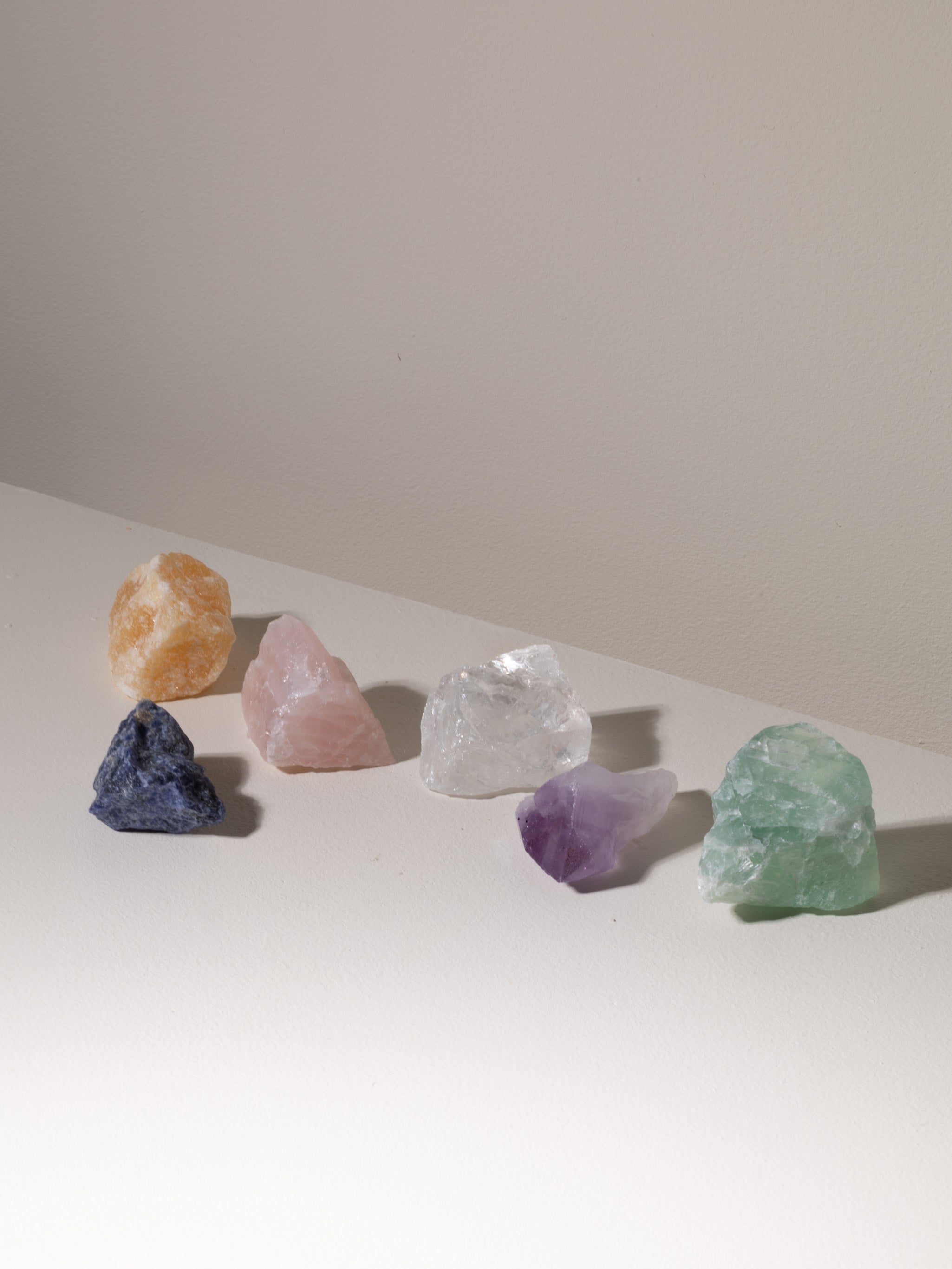 Du bekommst einen Rosenquarz, Bergkristall, Amethyst, Fluorit, Sodalith und ein Orangen Calcit Rohstein in bester Qualität.