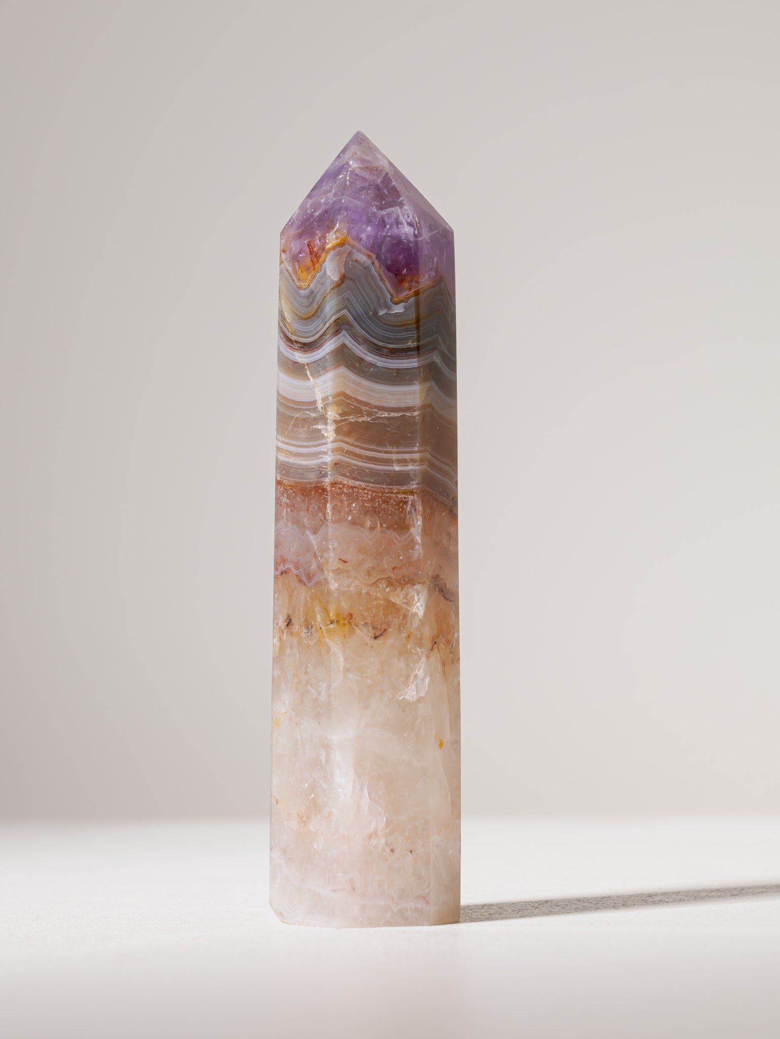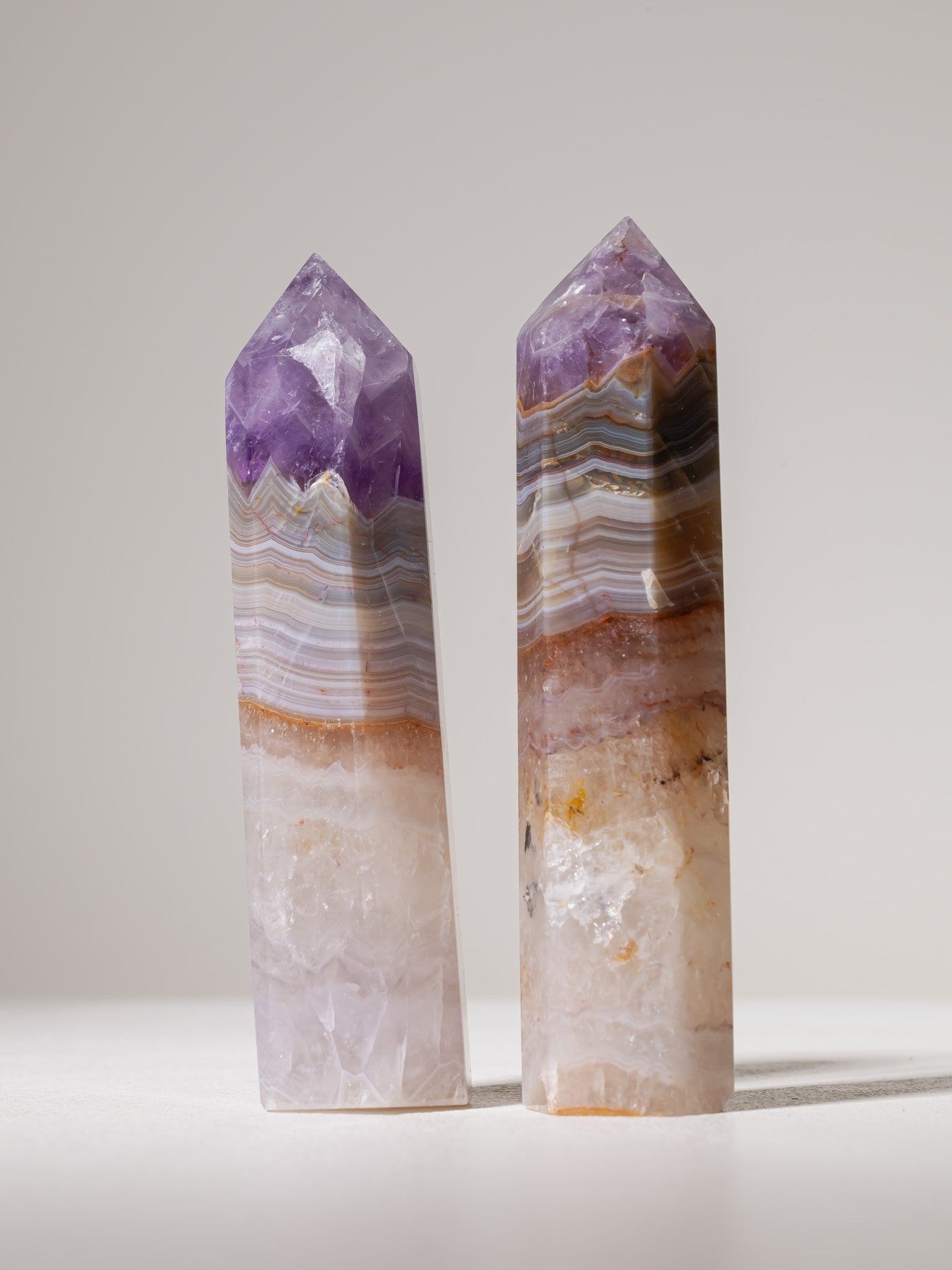 Amethyst-Achat vereint violette Bänder mit Achatstrukturen. Er gilt als Stein der Ruhe, Balance und spirituellen Klarheit.