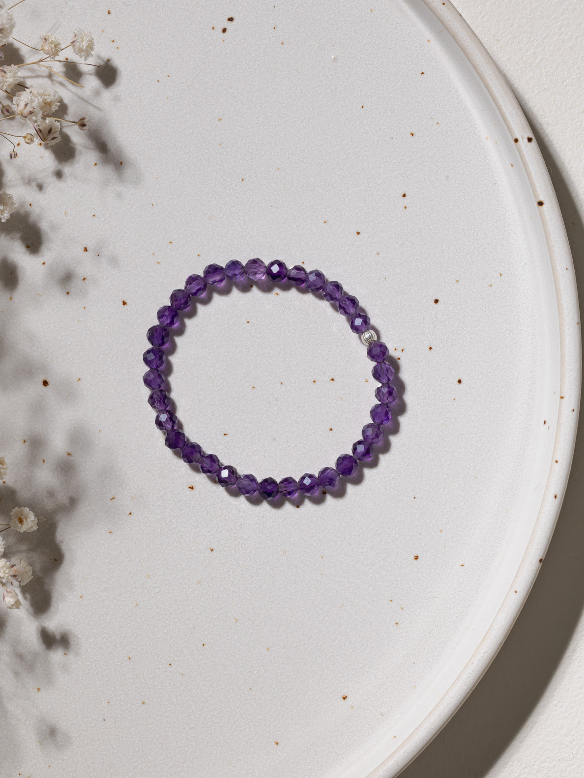 Amethyst leuchtet in Violett. Er steht für innere Ruhe, Spiritualität und Klarheit des Geistes.