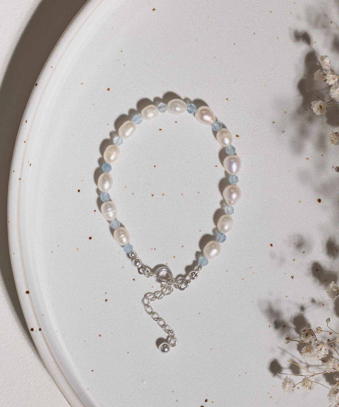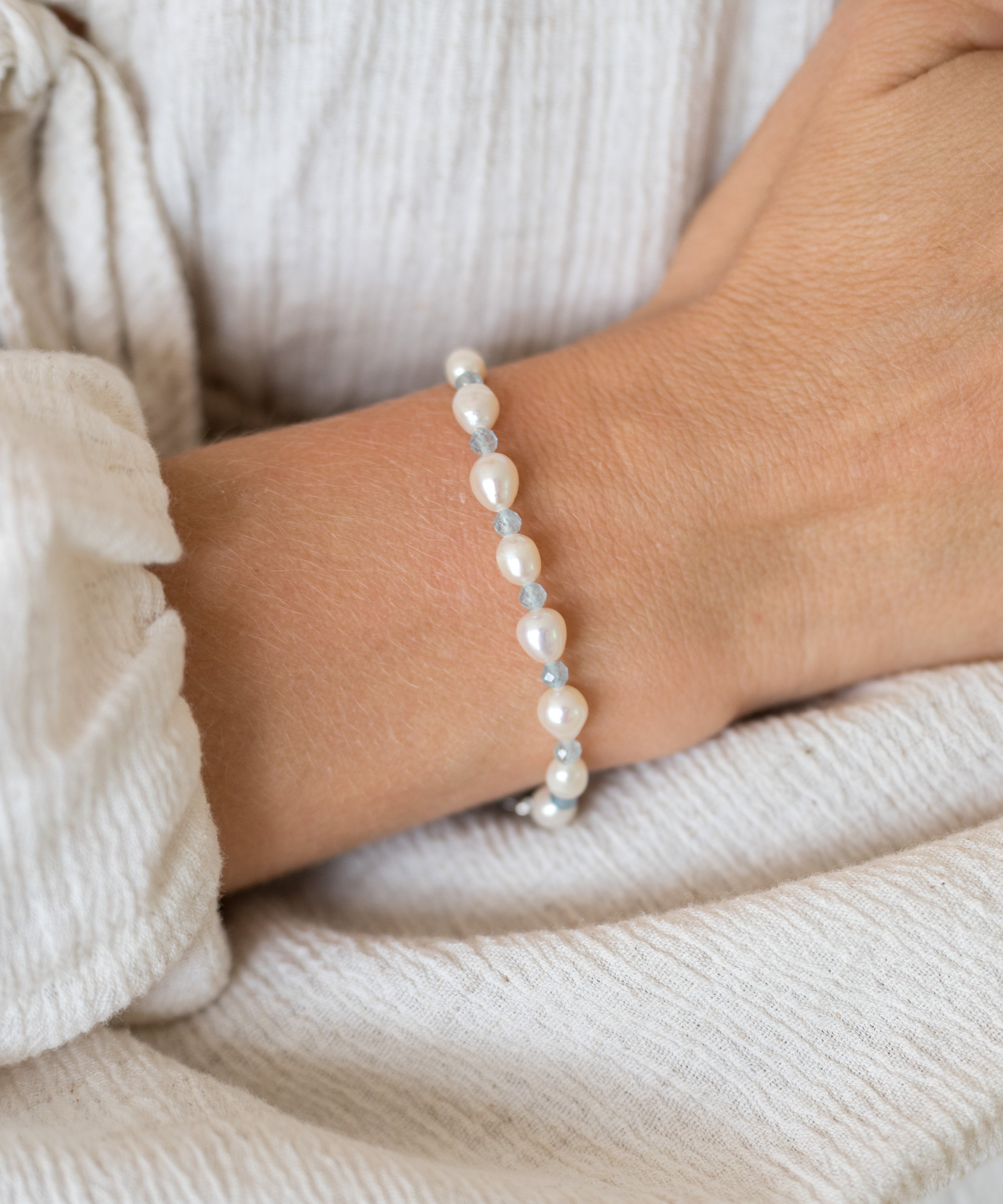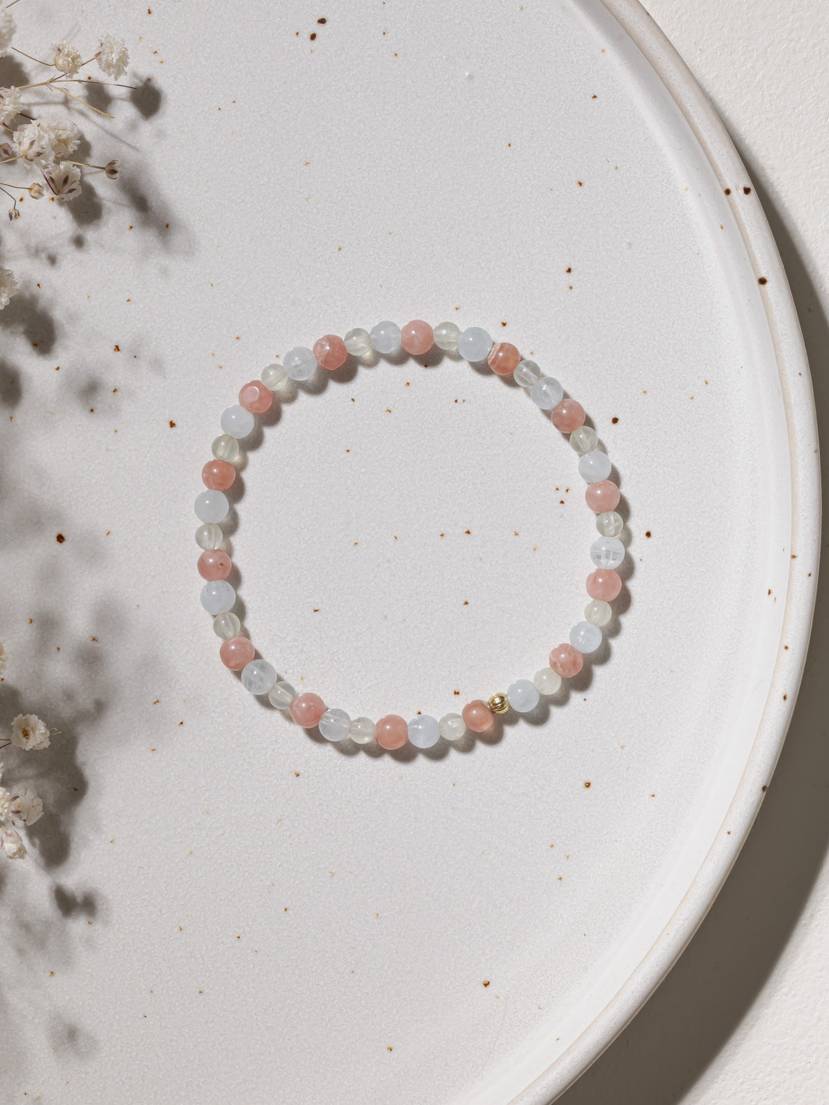 Dieses Armband vereint die klärende Energie des Aquamarins, die sanfte Energie des Rhodochrosits und die beruhigende Wirkung von Prehnit – für ein liebevolles Gleichgewicht von Kopf, Herz und Seele.