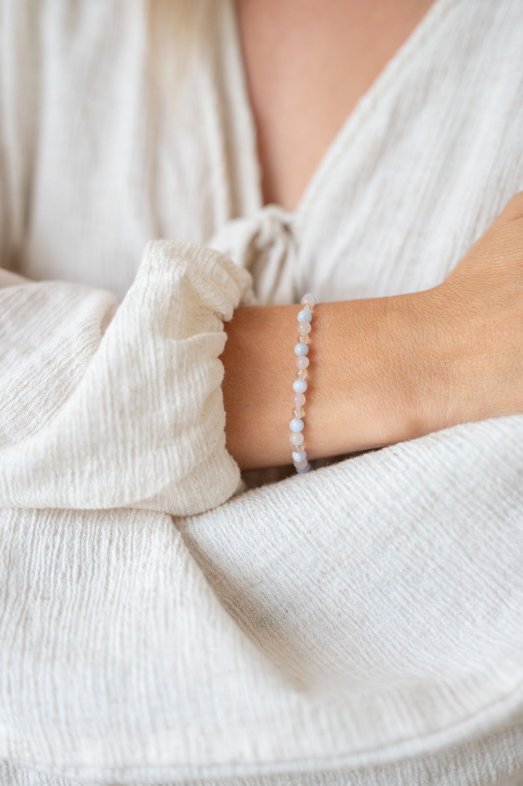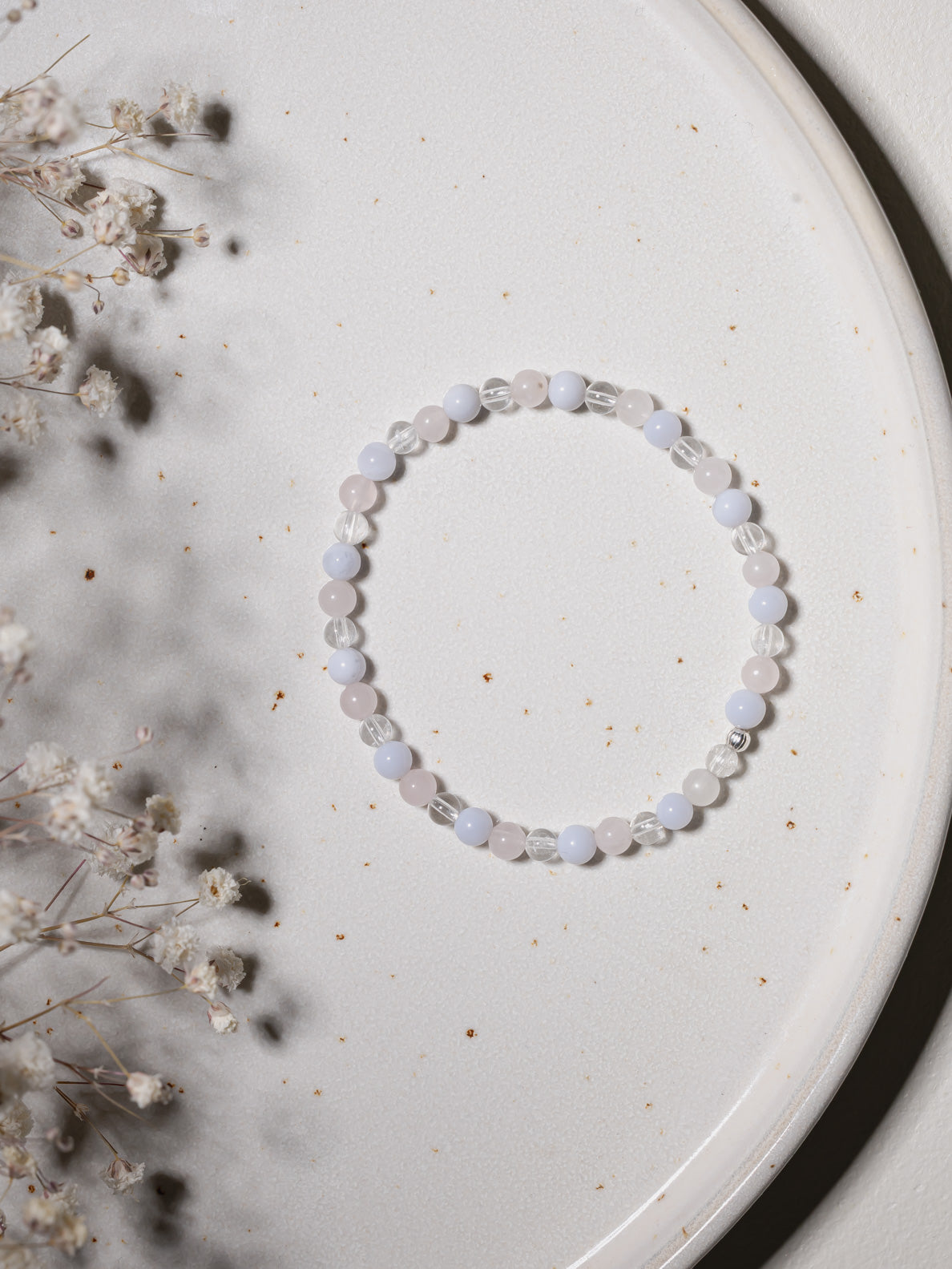 Dieses zarte Armband vereint drei harmonische Steine, die deich auf sanfte Weise stärken und begleiten können: