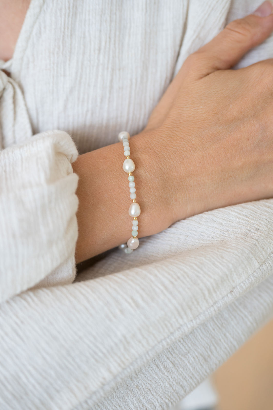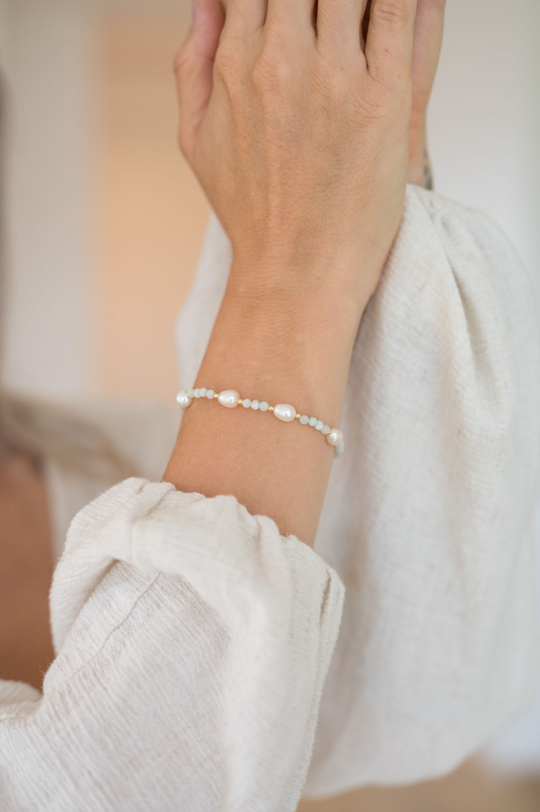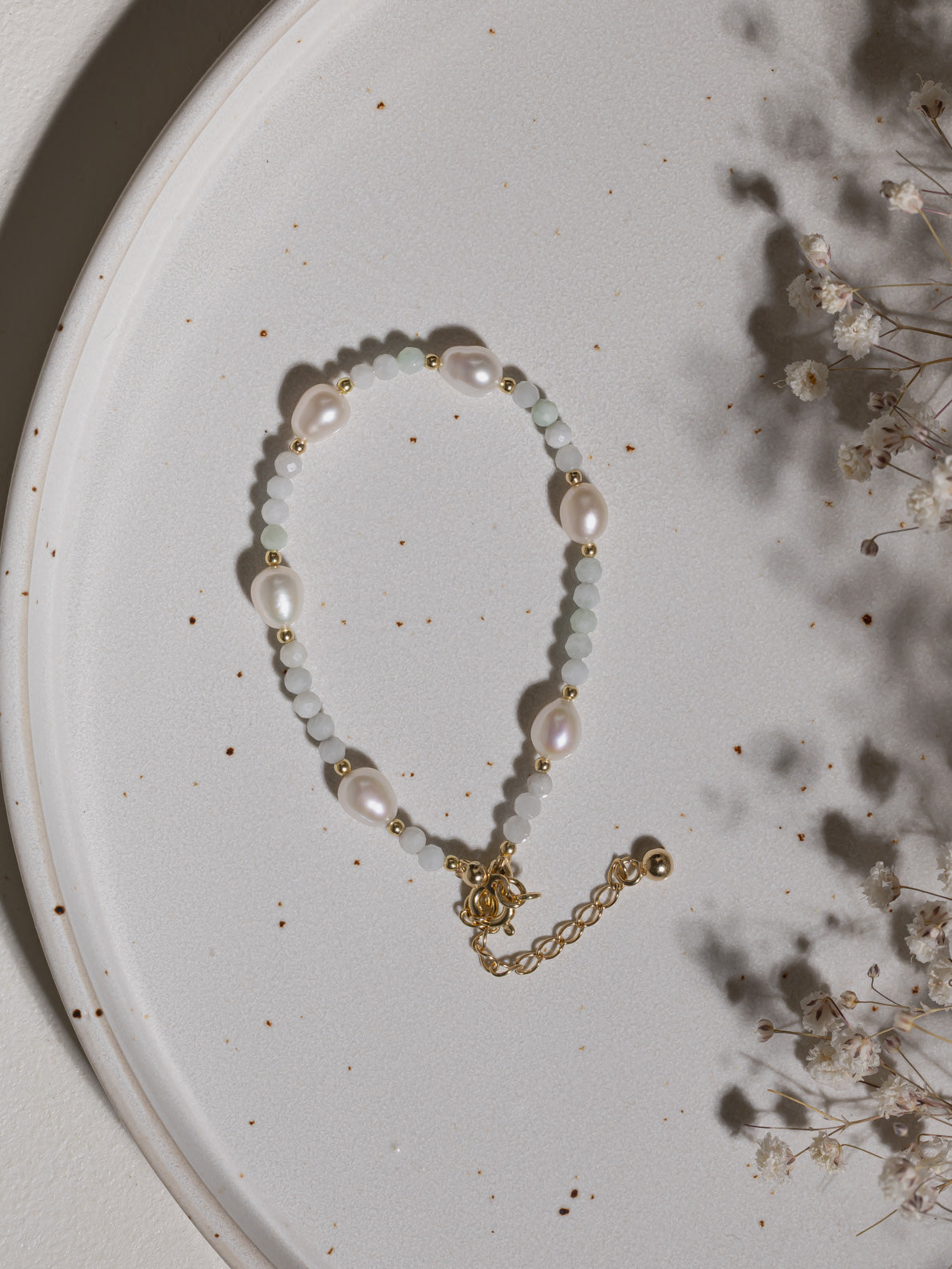Dieses Armband vereint die friedvolle, ausgleichende Energie des Jadeits mit der weichen, nährenden Kraft der Süßwasserperle – für eine liebevolle Verbindung zu dir selbst.