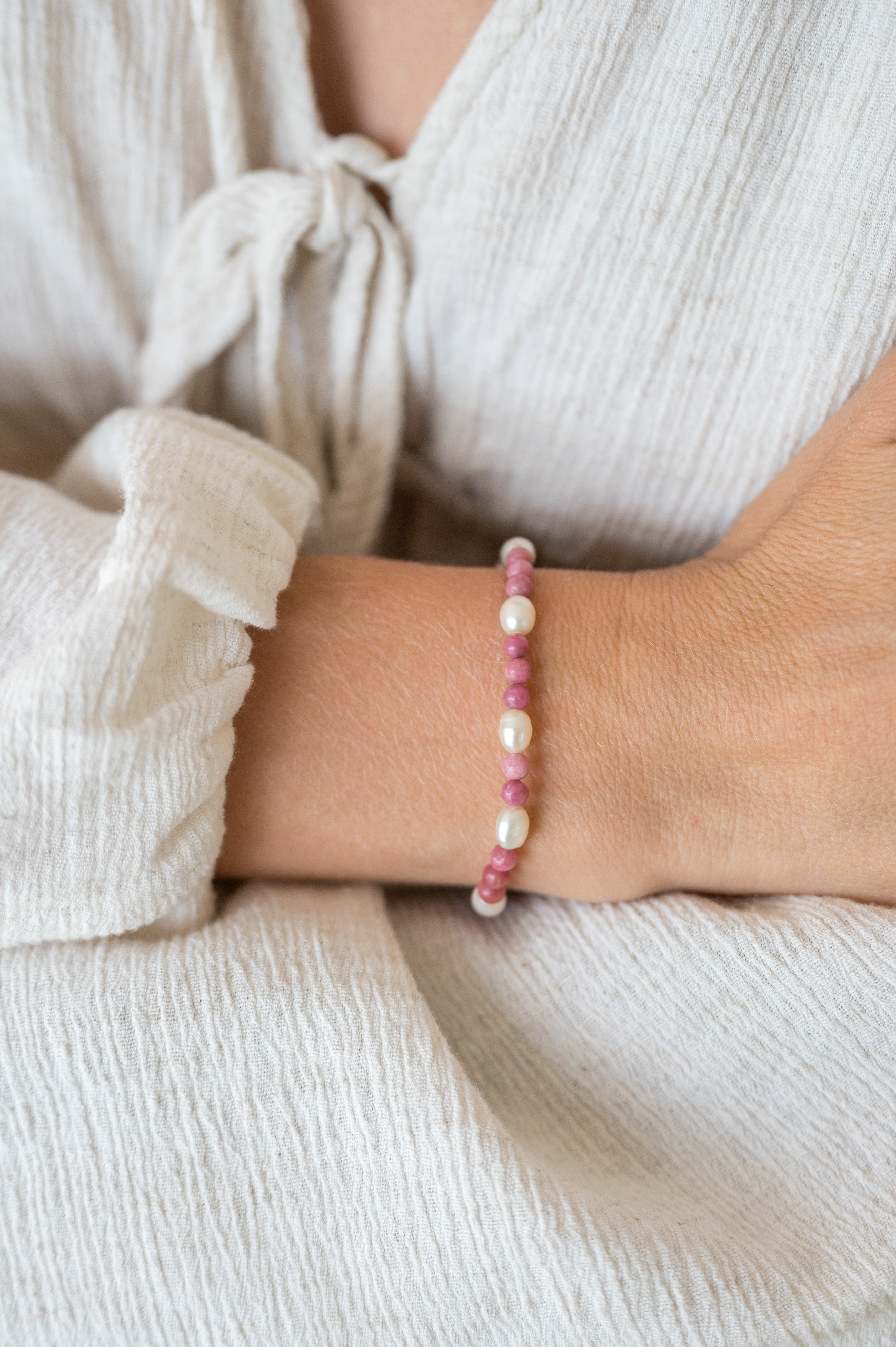 Rhodonit ist rosa bis rot mit schwarzen Adern. Er gilt als Stein der Liebe, des Mitgefühls und der Heilung.