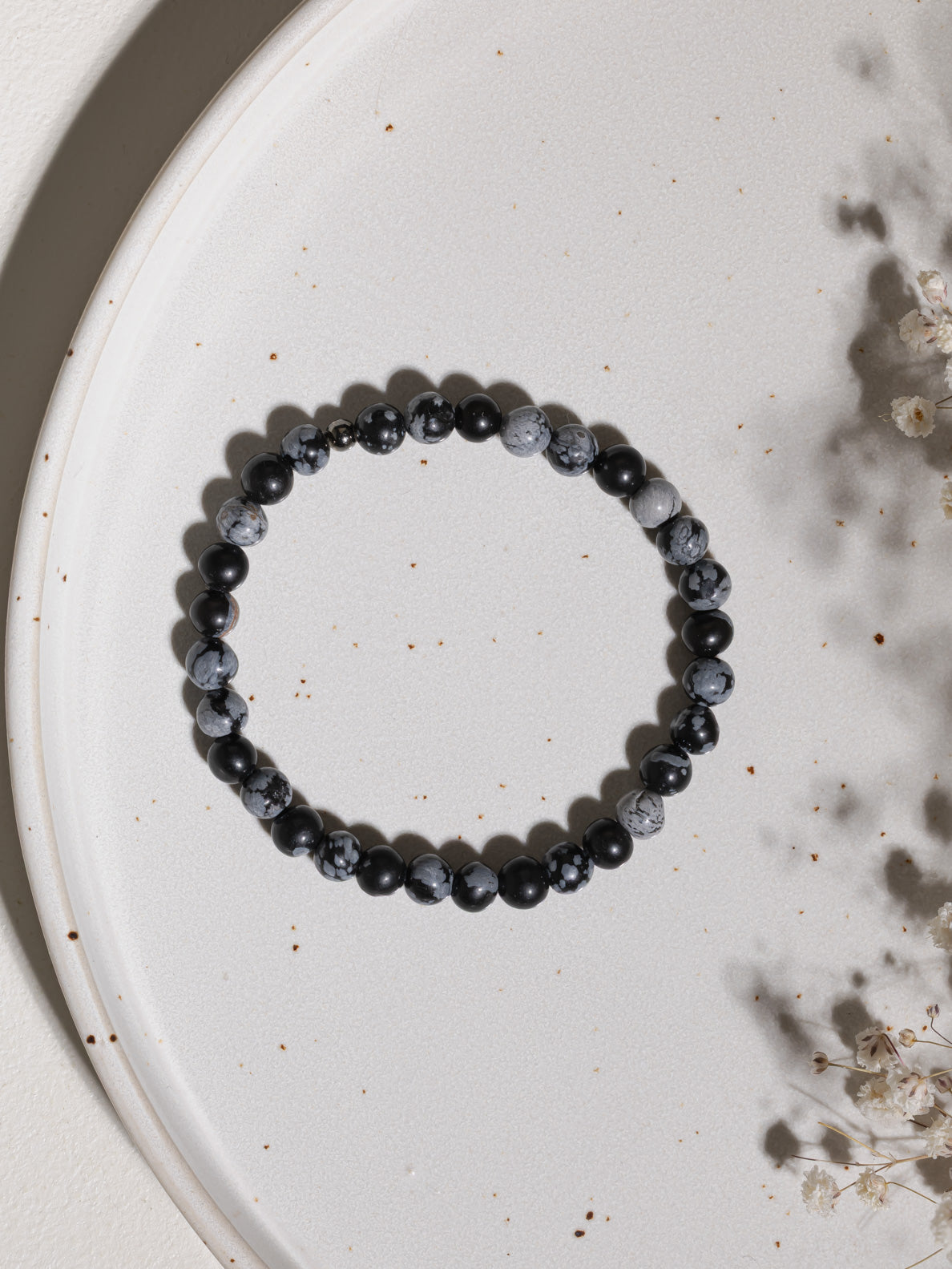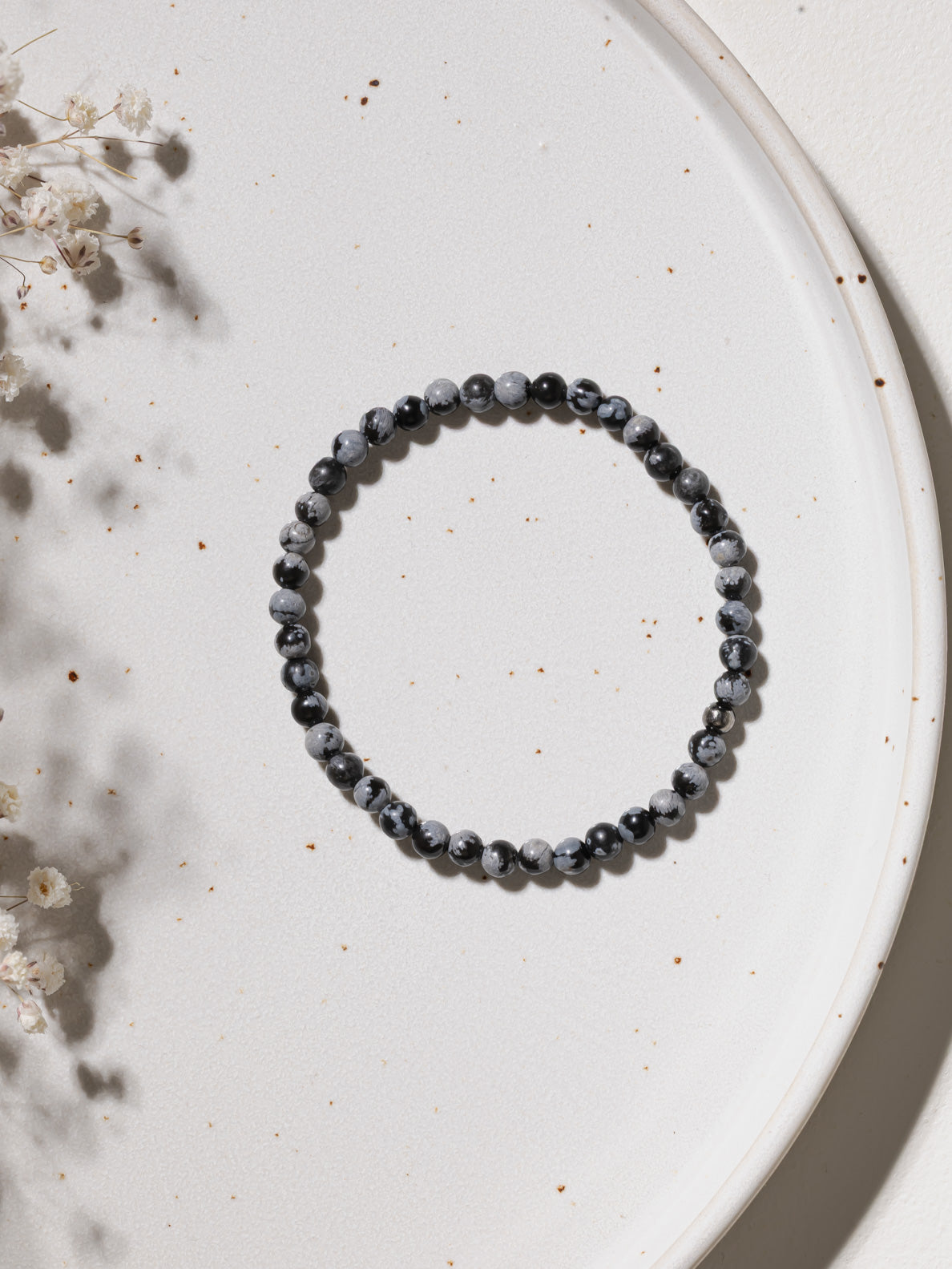 Dieses Armband mit Schneeflockenobsidian soll dich daran erinnern, in deiner Mitte zu bleiben – auch wenn es im Außen unruhig wird.